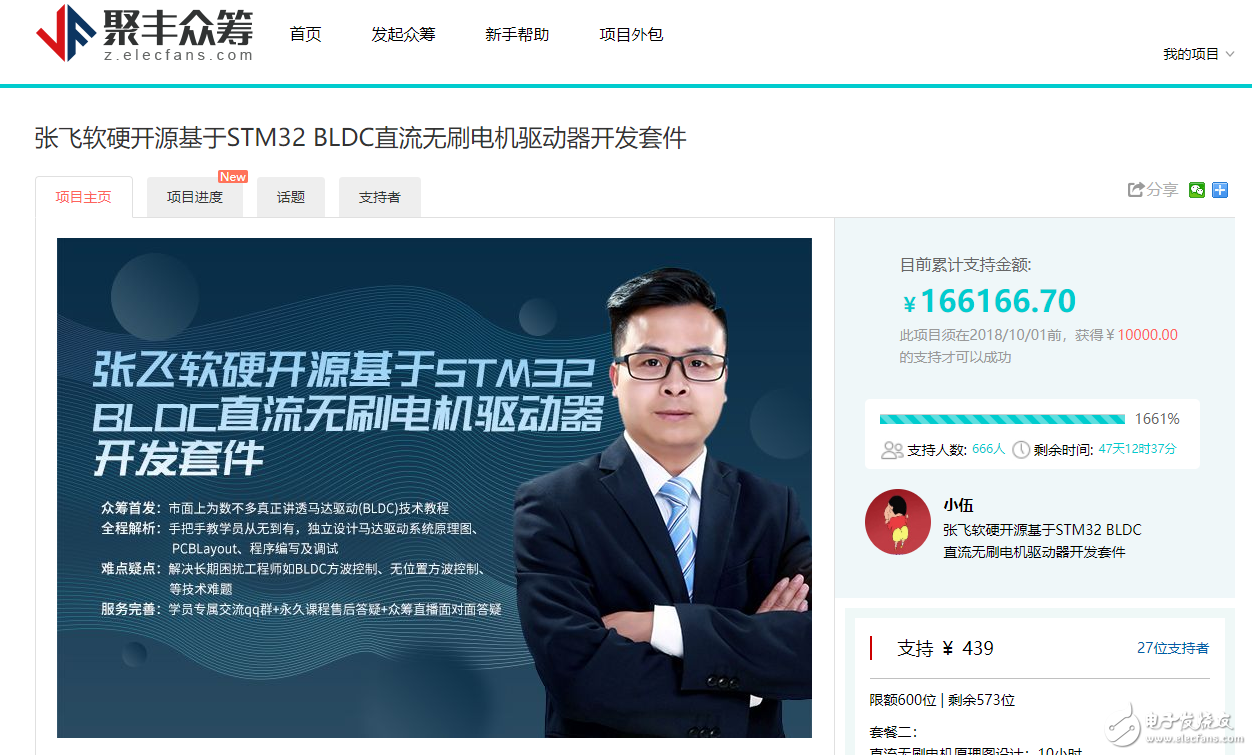 圖1: 張飛老師在華強(qiáng)聚豐眾籌平臺(tái)上的“BLDC直流無刷電機(jī)驅(qū)動(dòng)”培訓(xùn)課程上線后迅速獲得了1661%的認(rèn)購(gòu)結(jié)果。(本次眾籌頁(yè)面鏈接:http://z.elecfans.com/220.html)