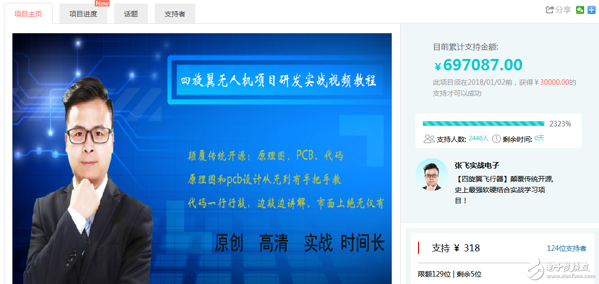 圖2:張飛老師在華強(qiáng)聚豐眾籌平臺(tái)上的“四旋翼無人機(jī)項(xiàng)目研發(fā)實(shí)戰(zhàn)套件”,最終認(rèn)購(gòu)金額達(dá)到了近70W,是聚豐眾籌史上最高認(rèn)購(gòu)項(xiàng)目。(本次眾籌頁(yè)面鏈接:http://z.elecfans.com/151.html)